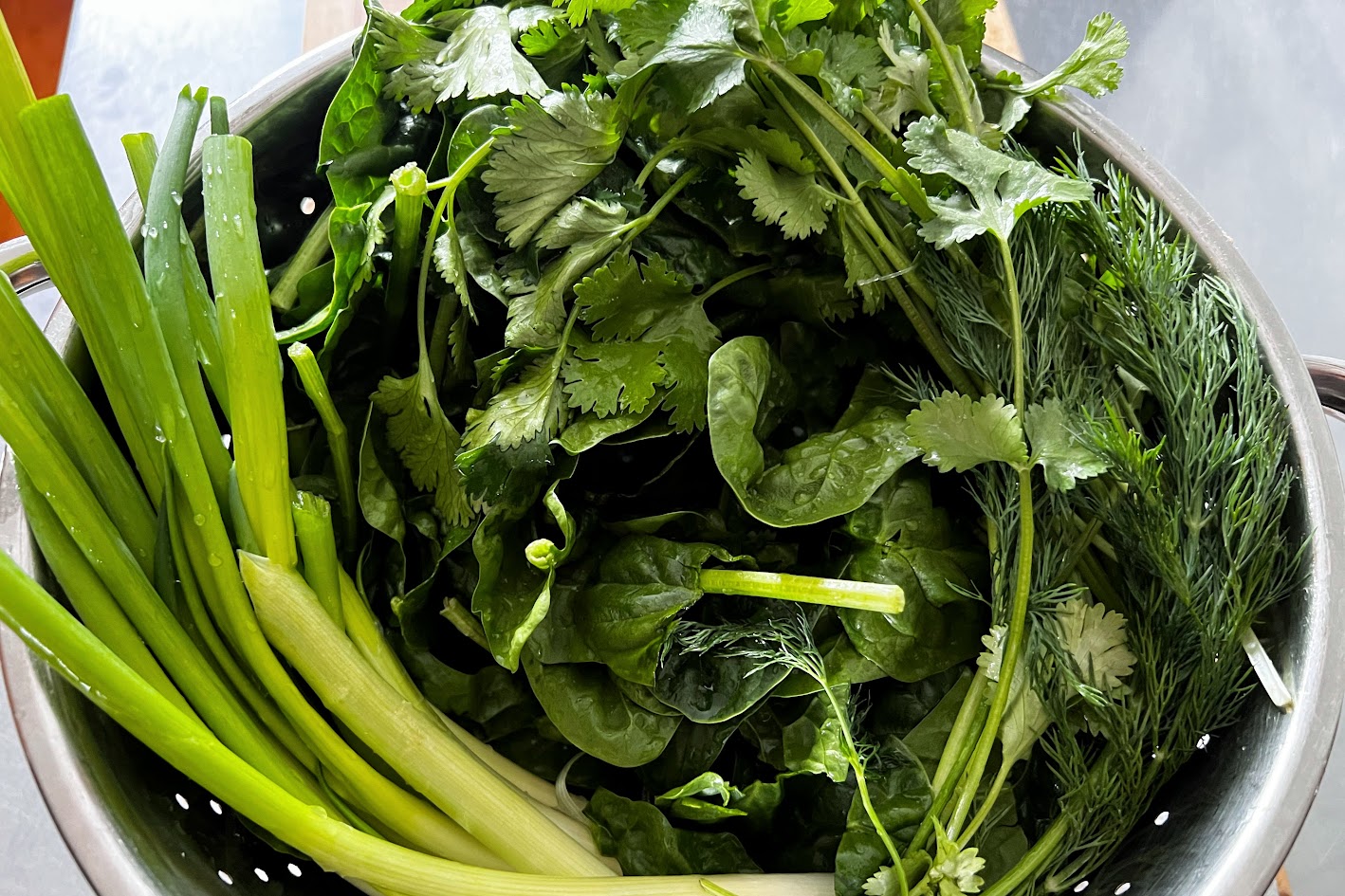 In Vermont, spinach is among the first harvests of the season. Often, we begin to see this herbaceous plant appear in gardens, and at farmers markets by early June. Herbaceous vegetables (soft stems and leaves) include spinach, lettuce and collard greens. Herbs are plants with fragrant and aromatic properties and are often herbaceous too. Our recipe for Stewed Spinach, Dill and Cilantro combines the herbaceous and the herby, and is inspired by a traditional Afghan dish, Sabzi. Sabzi is a Persian word referring to all green vegetables (like spinach and scallions) and green herbs (like dill and cilantro). This recipe may be used as a side dish, a filling or an appetizer. It is best paired with Greek yogurt and a naan or pita bread. It is a delightful dish, easy to make and full of flavor.